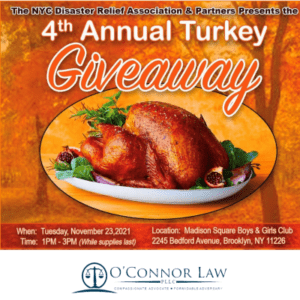The NYC Disaster Relief Association & Partners Presents the 4th Annual Turkey Giveaway on Tuesday, November 23, 2021. Join us as we help give back to the very community that supports us!
